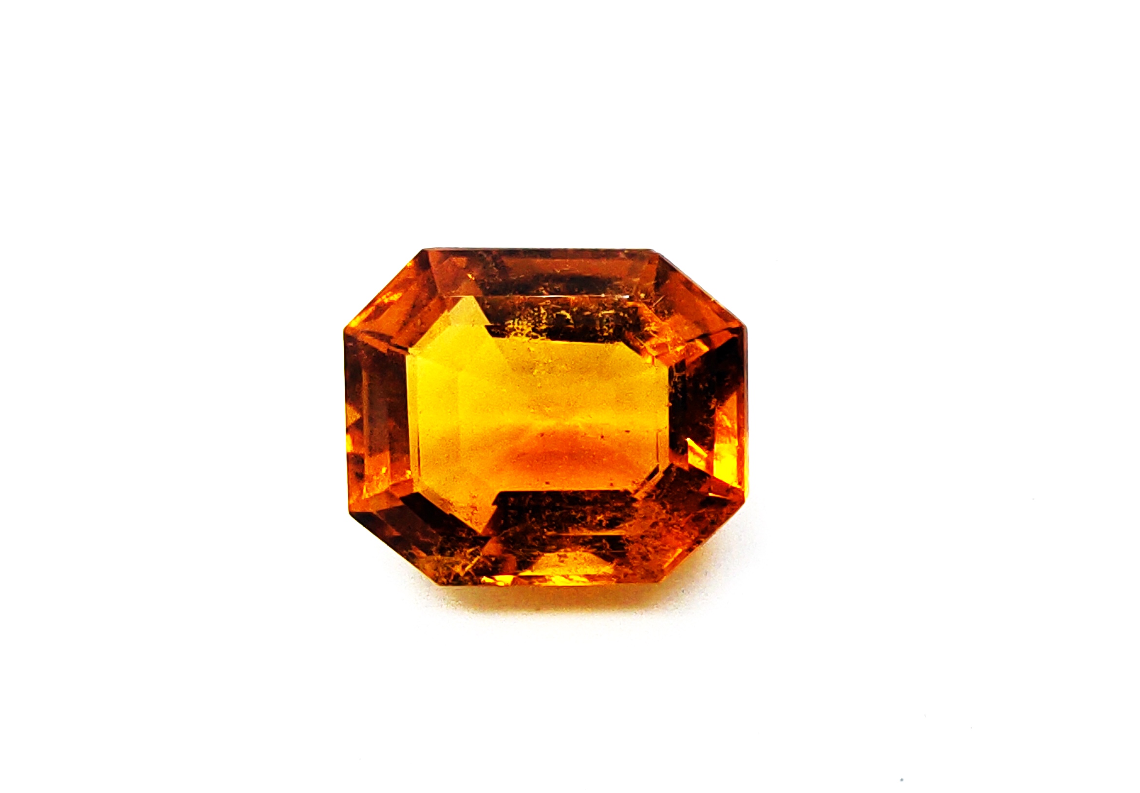 The 10-carat citrine, mined in Madagascar, features a vibrant golden-orange hue and is cut in an elegant emerald shape