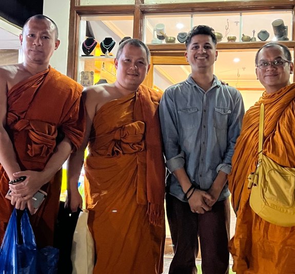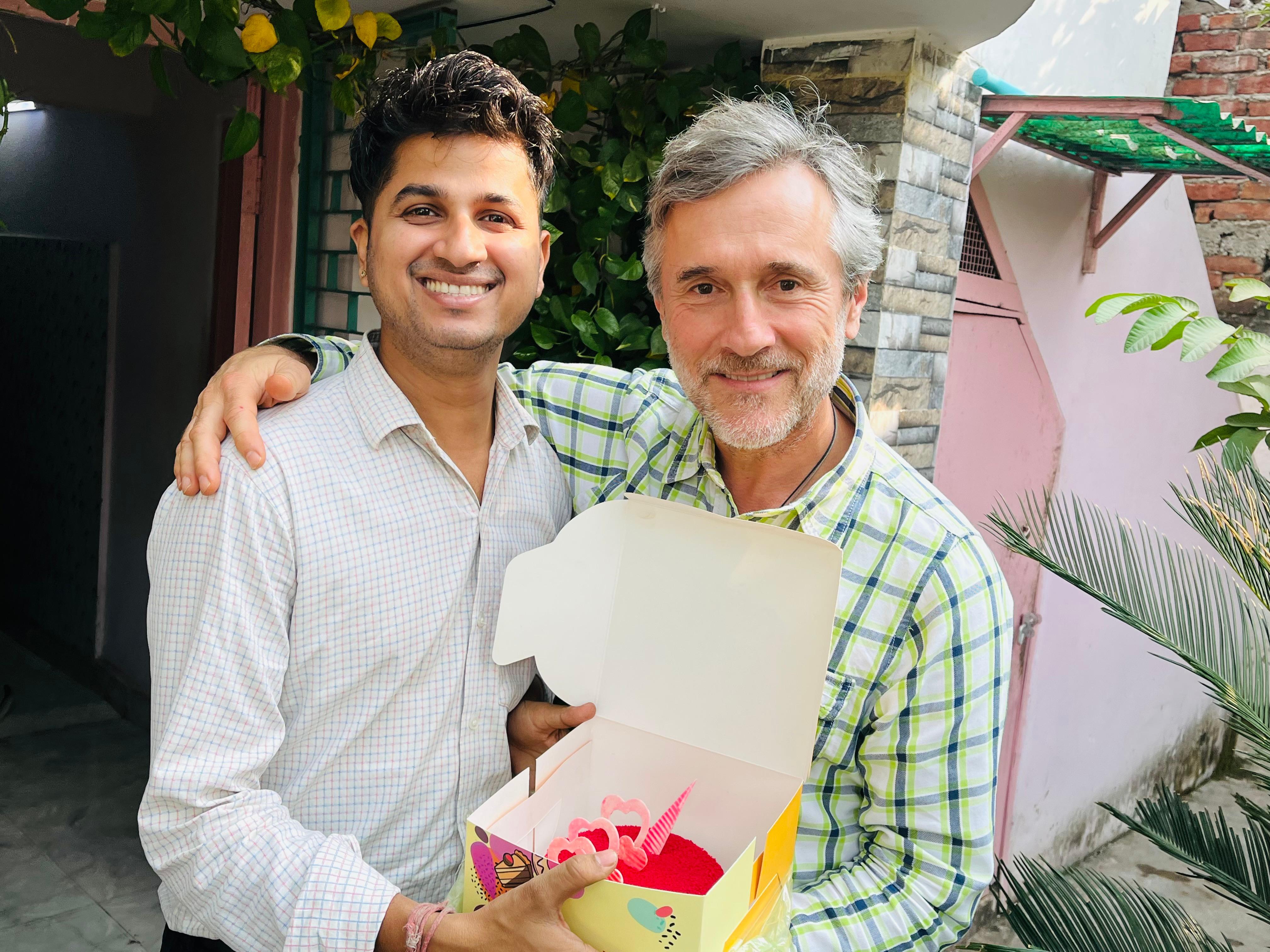 In the above photos, the three monks received jade malas from us. In the next photo, a customer from Switzerland traveled to India to wish me a happy birthday after I helped him find a gemstone that supported his daughter in overcoming pregnancy challenges
