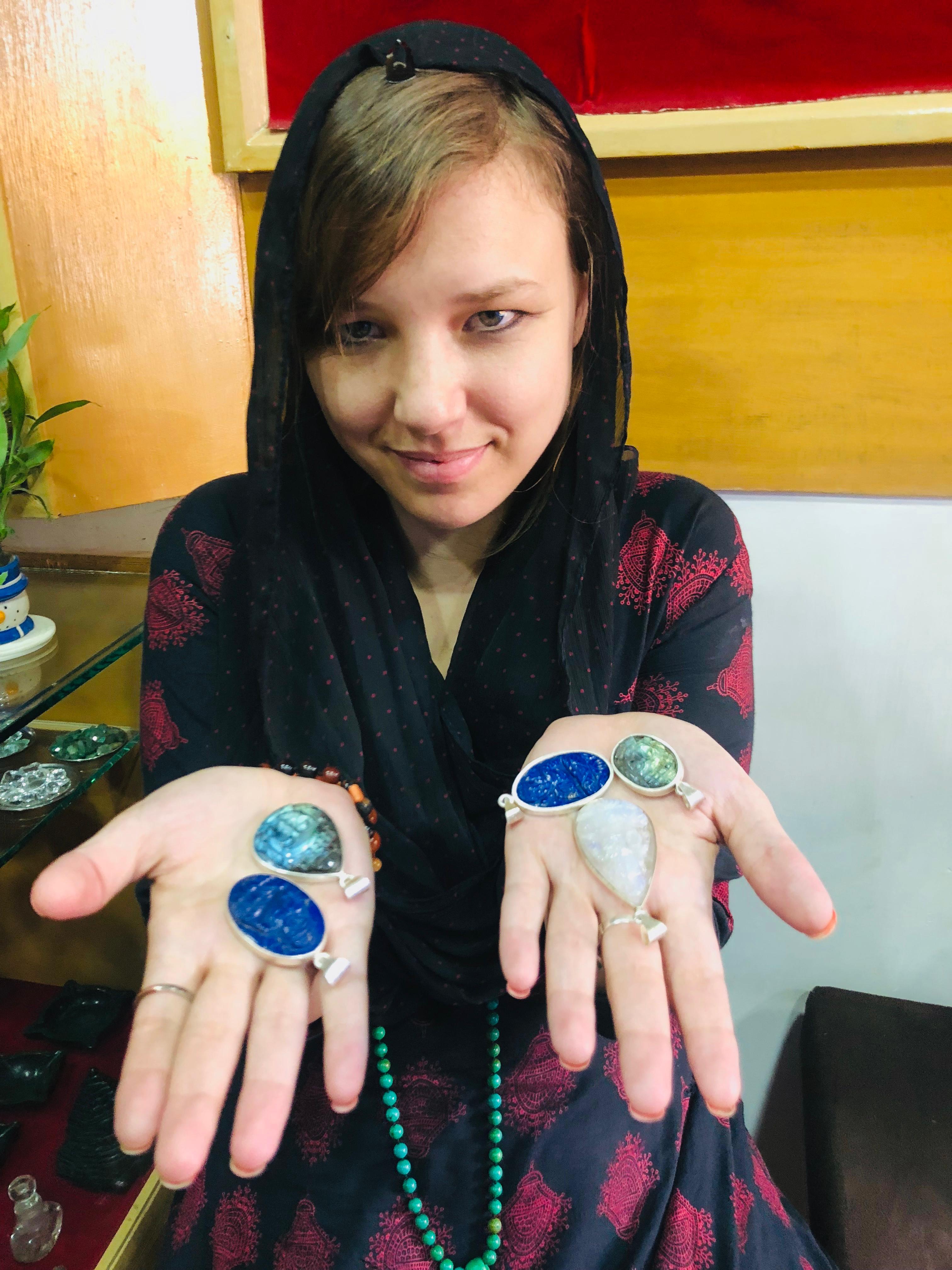 An American customer is purchasing silver Buddha pendant studs made from lapis lazuli and labradorite as gifts for her friends and family back home